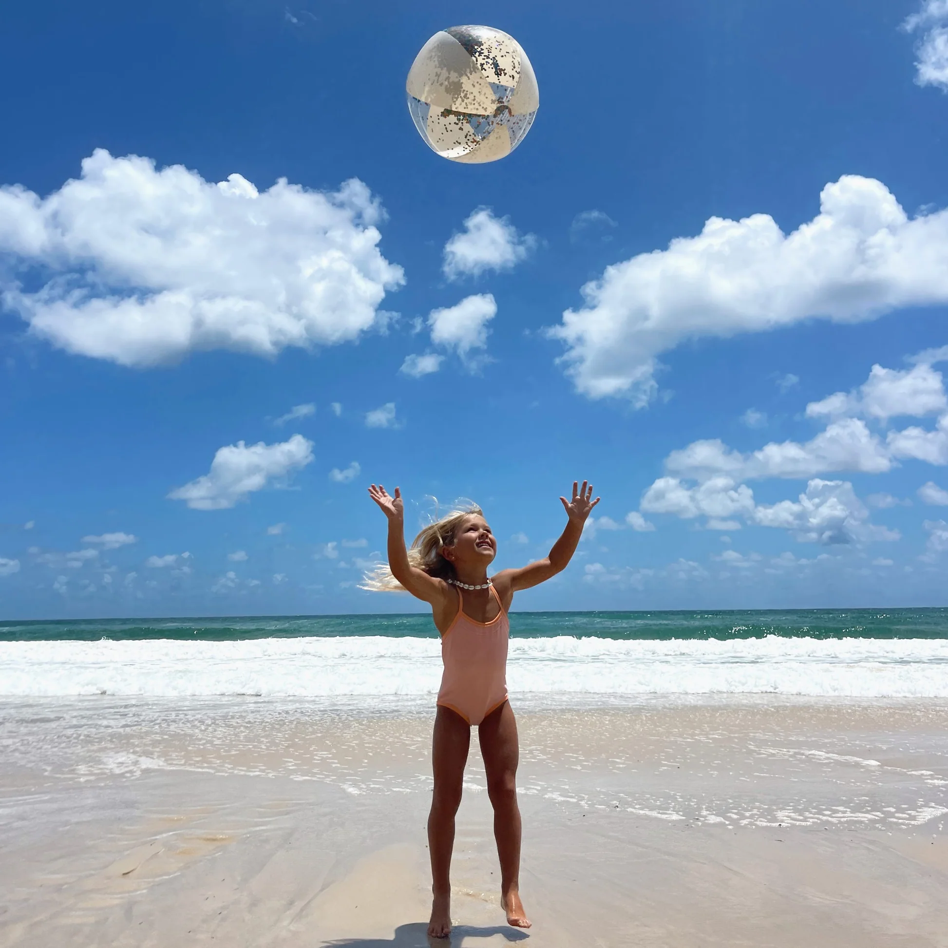 Dodaj odrobinę blasku do wakacyjnej zabawy! Nadmuchiwana piłka plażowa SUNNYLiFE wypełniona wielokolorowym brokatem sprawi, że każda gra stanie się jeszcze bardziej efektowna. Idealna zarówno dla dzieci, jak i dorosłych – na plażę, basen czy do ogrodu.